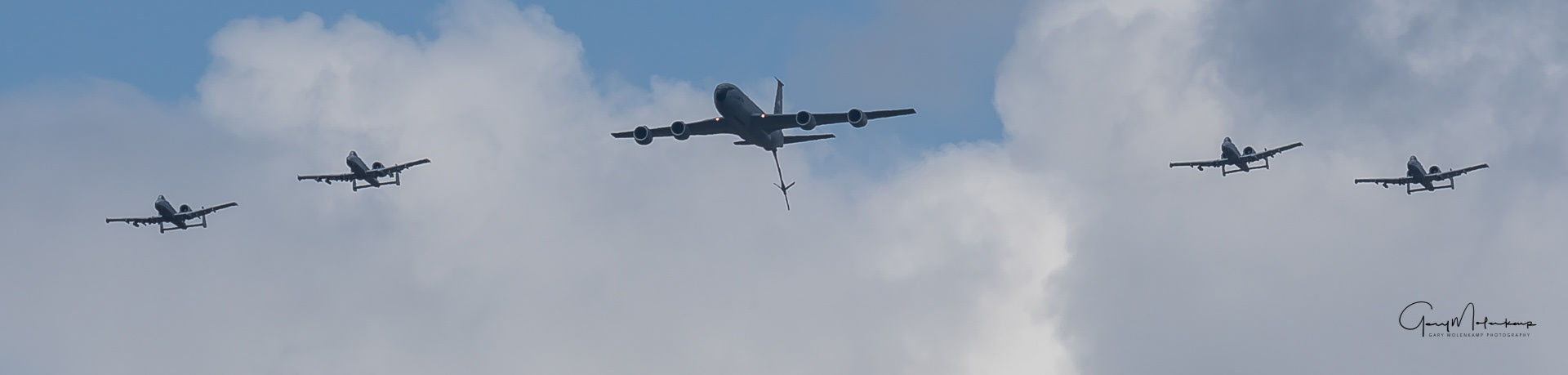 Four A-10s in formation with a KC-135