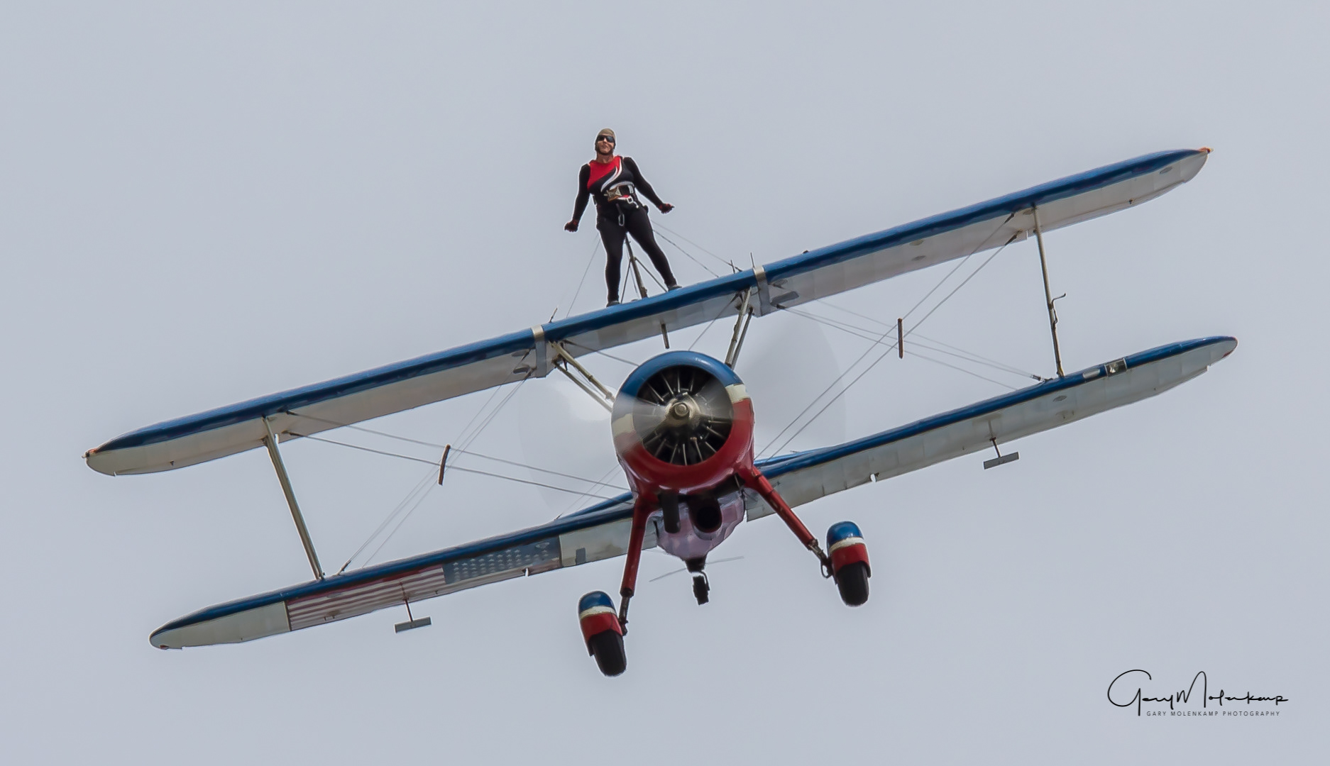 Ashley Shelton walks the wings with her husband Greg at the controls